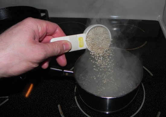 First, fill a small pot with one cup of water, and turn your burner on high. While the water is heating up, measure out a quarter cup of steel-cut oats. Once the water has reached a rolling boil, turn off the stove and move the pot off the hot burner.